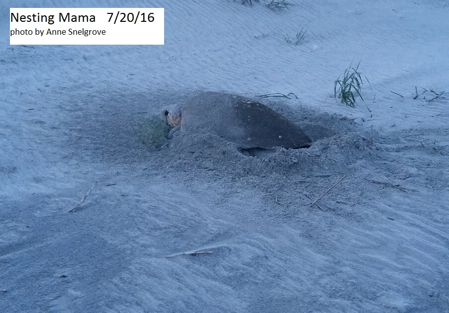 At dusk on Wednesday, July 20th, several onlookers and Turtle Patrol Members had the good fortune to see the Loggerhead come ashore and lay her nest. The crawl was found the next morning by Marsh Papanek & Joyce & Tom Pinckney. The nest was located by Bill & Eileen Middleton and relocated above the high tide line.