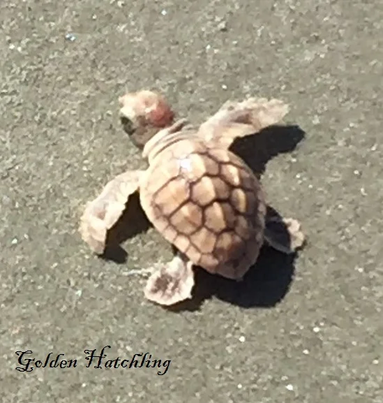 During yesterday's inventory of nest 46 the inventory crew found two unique golden colored hatchlings. One had already hatched and one was just coming out of the nest. The golden color was very striking and beautiful.We thought you'd like to see a photo.