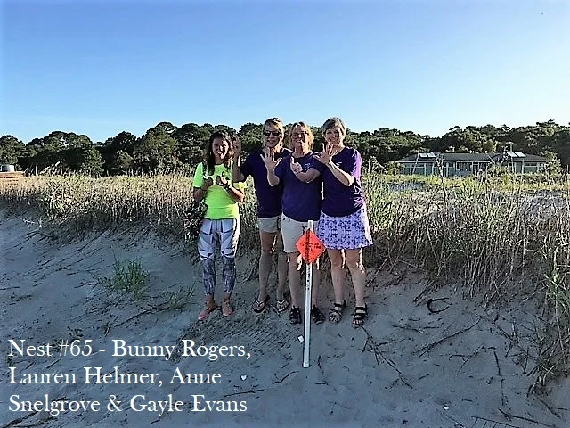 Anne Snelgrove, Bunny Rogers, Lauren Helmer & Gayle Evans Reported a crawl about 70 yards south of boardwalk 9. Bill Greubel responded and found nest 65. They relocated the nest to higher ground 150 yards south of the American flag at the Camp.