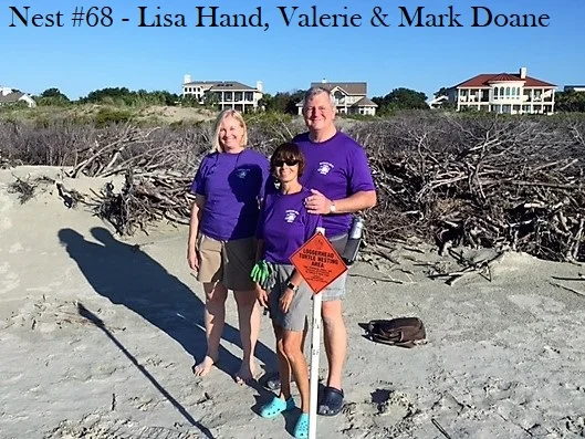 Nest 68 was found by a group of visitors around 11: 30 PM Saturday when they noticed the hatchlings coming out. The visitors were still there and the hatchlings still coming out when Valerie & Mark Doane & Lisa Hand walked the beach Sunday morning. The Doanes were impressed with the knowledge of the visitors. It turns out they had been visiting Seabrook Island for several years and always followed the Turtle Patrol events. Nice to know our education programs are working. There were also 4 false crawls so we know the turtles are still out there. Hopefully, there are still more nests to come.