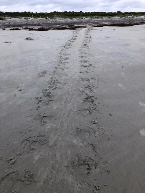 Walkers Joleen Ardaiolo, Alison Bowers, Sandy MacCoss and Kathy Noel found our first crawl of the season in front of the protected bird area on North Beach. Bill Greubel responded with the Turtle Patrol truck and he and Sandy MacCoss probed. Sandy found the nest which was left in situ above the high tide line. We weren't able to get our usual nest photo because we had to limit traffic in the protected bird area. We do have a picture of the crawl. (see below)