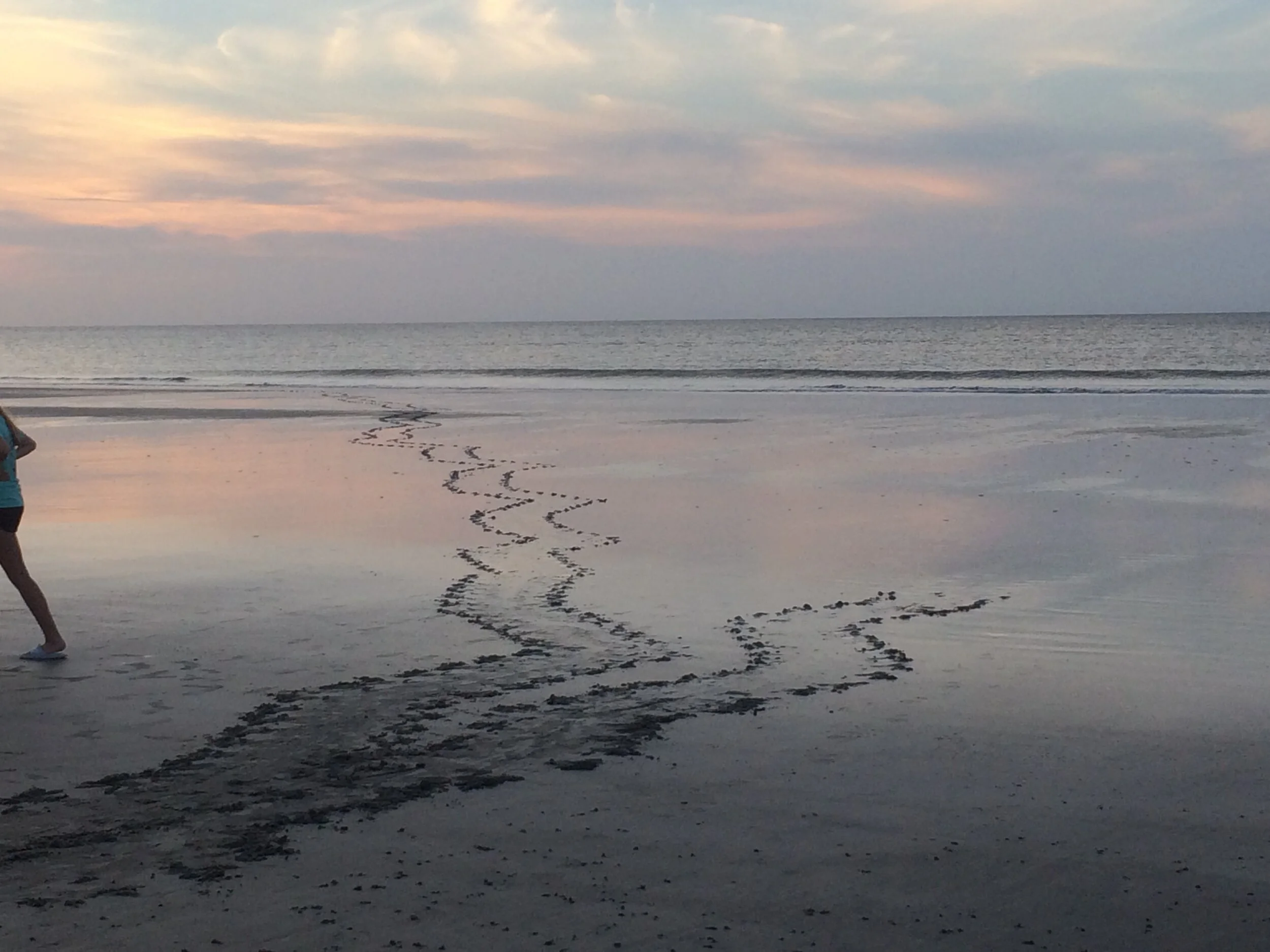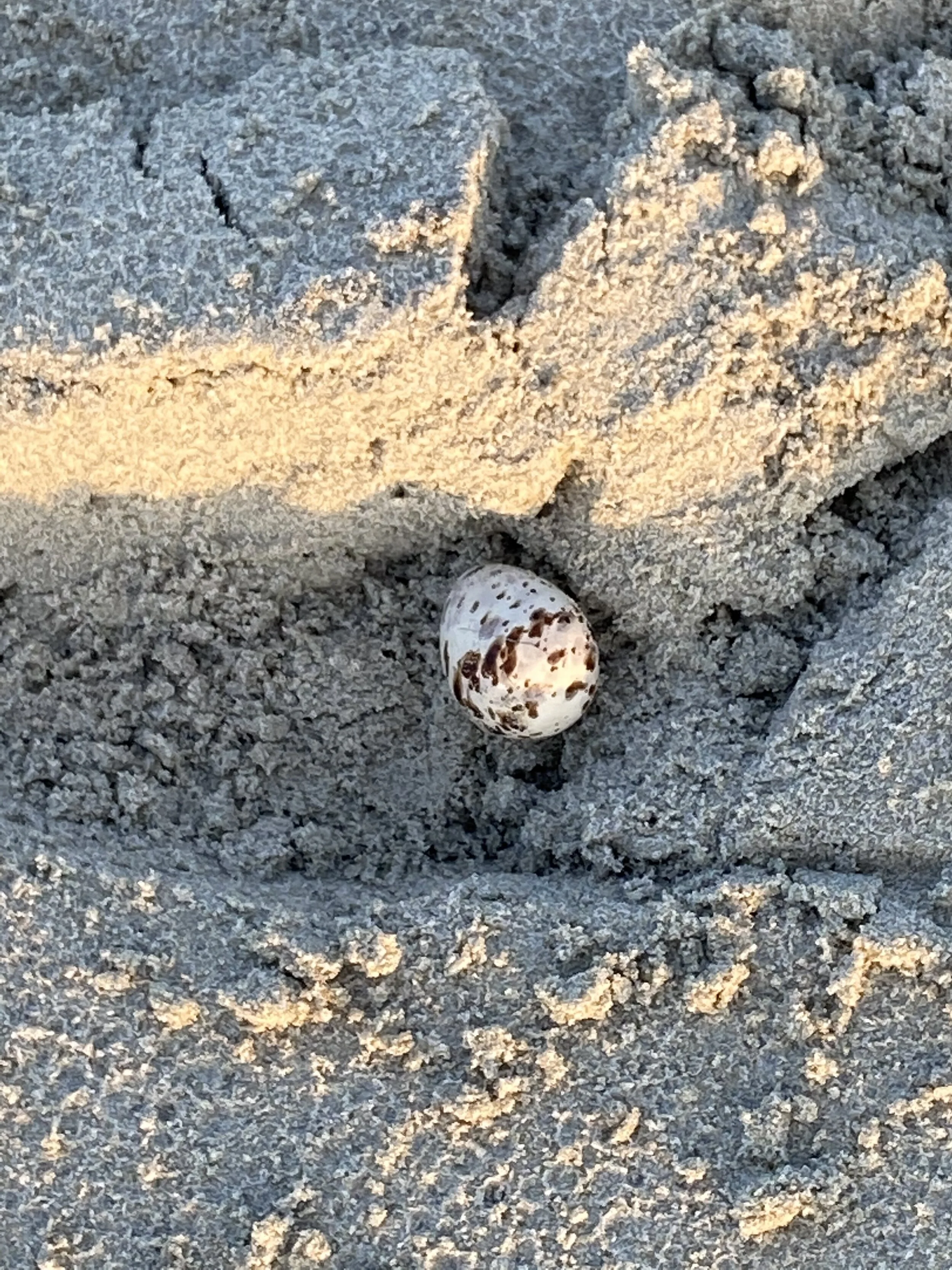 Walkers Lindsey Capp and Kathy Hanson called in a long beautiful crawl between Boardwalks 2 & 3. It was probed by Mike Vinson and the 120 eggs making up nest 38 were moved back about 20 yards to avoid high tides. They also found a Least Tern egg in the middle of the turtle tracks, poor bird thought the turtle did the work for her.