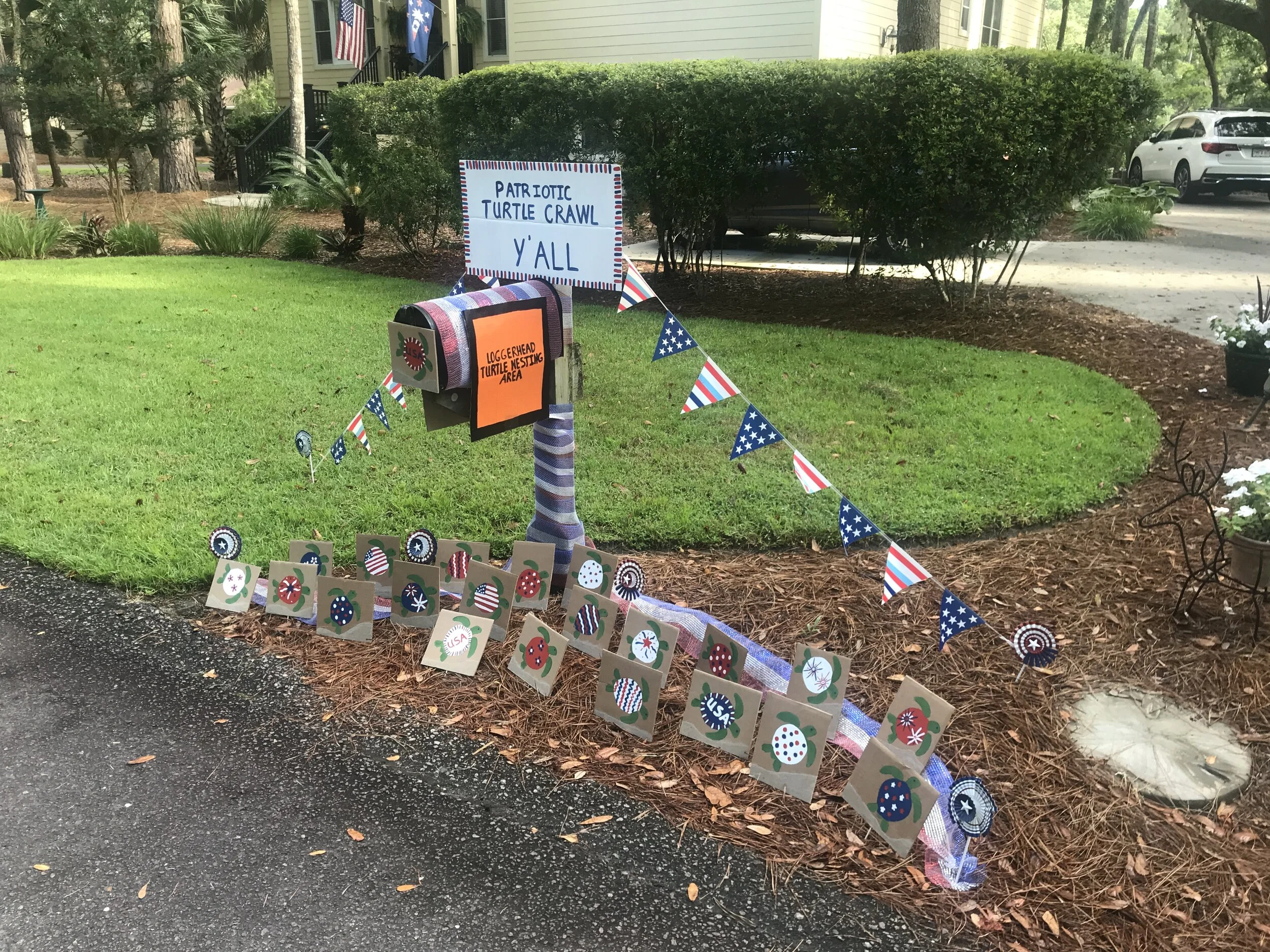 Seabrook Island has a tradition of decorating our mailboxes to celebrate the 4th of July. This year, Turtle Patrol Member Lynne Madison gave her daughter in law Marci free reign to decorate her mailbox. She chose a sea turtle theme and created the masterpiece depicted below. Feel free to drive by 2465 Bateau Trace to see it in person.
