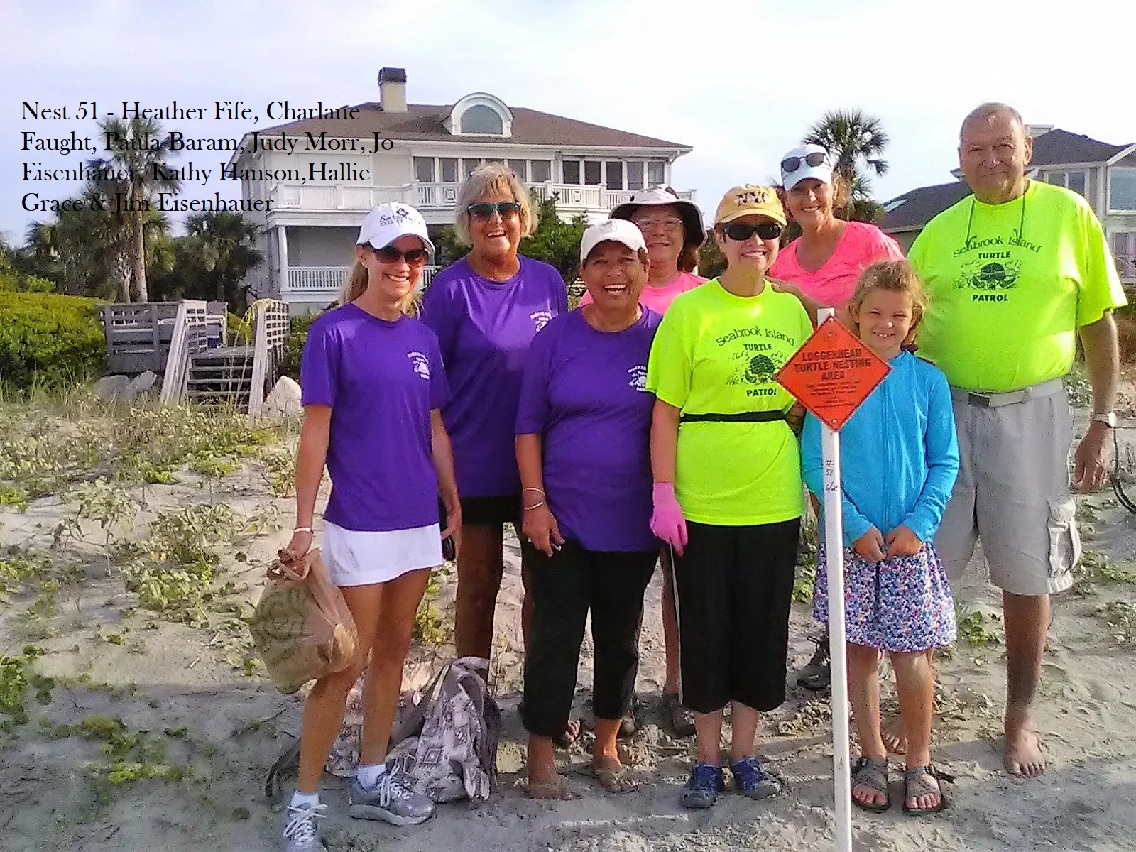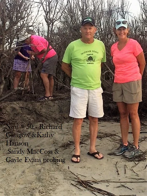 Deb Wein, Dave Roberts and Norm Powers called first with 2 crawls. The first was into the myrtles just north of where the horses enter the beach. The second was near boardwalk 4. The Middletons responded. Bill started at the myrtles. After significant probing, he took a break from that site and went to the crawl near boardwalk 4. There he found Nest 53 and its 87 eggs. Norm and Eileen Middleton worked together to move it to its new home north of boardwalk 6.