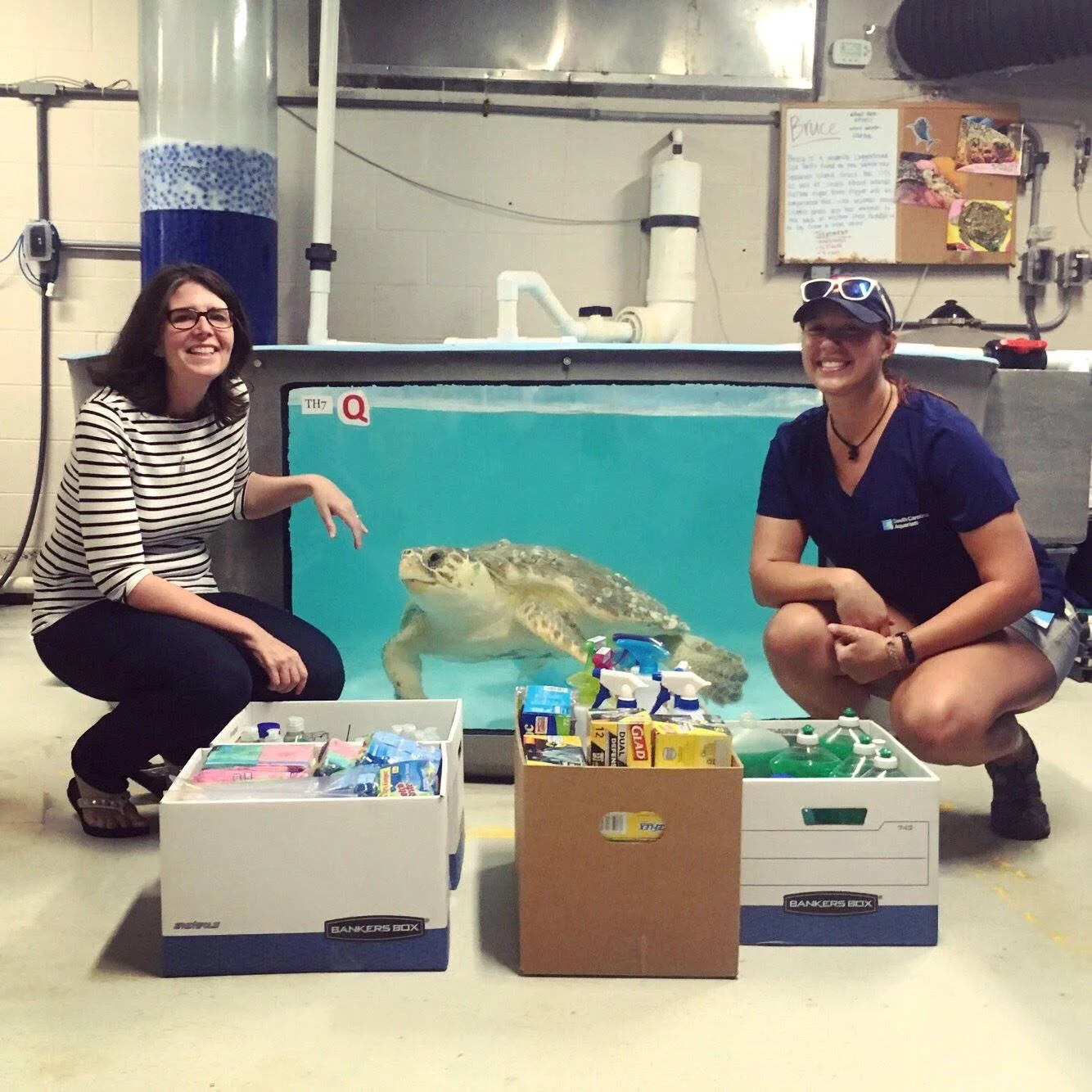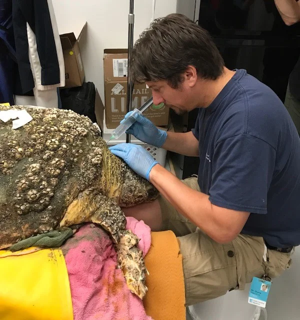 On May 3, 2017, Bruce arrived at the Aquarium Sea Turtle Hospital which I'm sure you all remember hearing about. As a refresher, Ray and Lucy Hoover, and Lauryn Gilmer discovered Bruce on their walk. Terry Fansler, Sandy MacCoss and Bill Greubel arrived on the scene expecting to do probing and discovered a stranding of a very sick loggerhead turtle instead. They were able to get the turtle into the Turtle Patrol Truck. Keeping the turtle hydrated, they drove the truck to the Fansler's driveway to await the Department of Natural Resources. By mid-morning, Jenna Cormany from the DNR arrived and the crew moved the turtle to the DNR truck for transport to the Turtle Hospital at the South Carolina Aquarium.